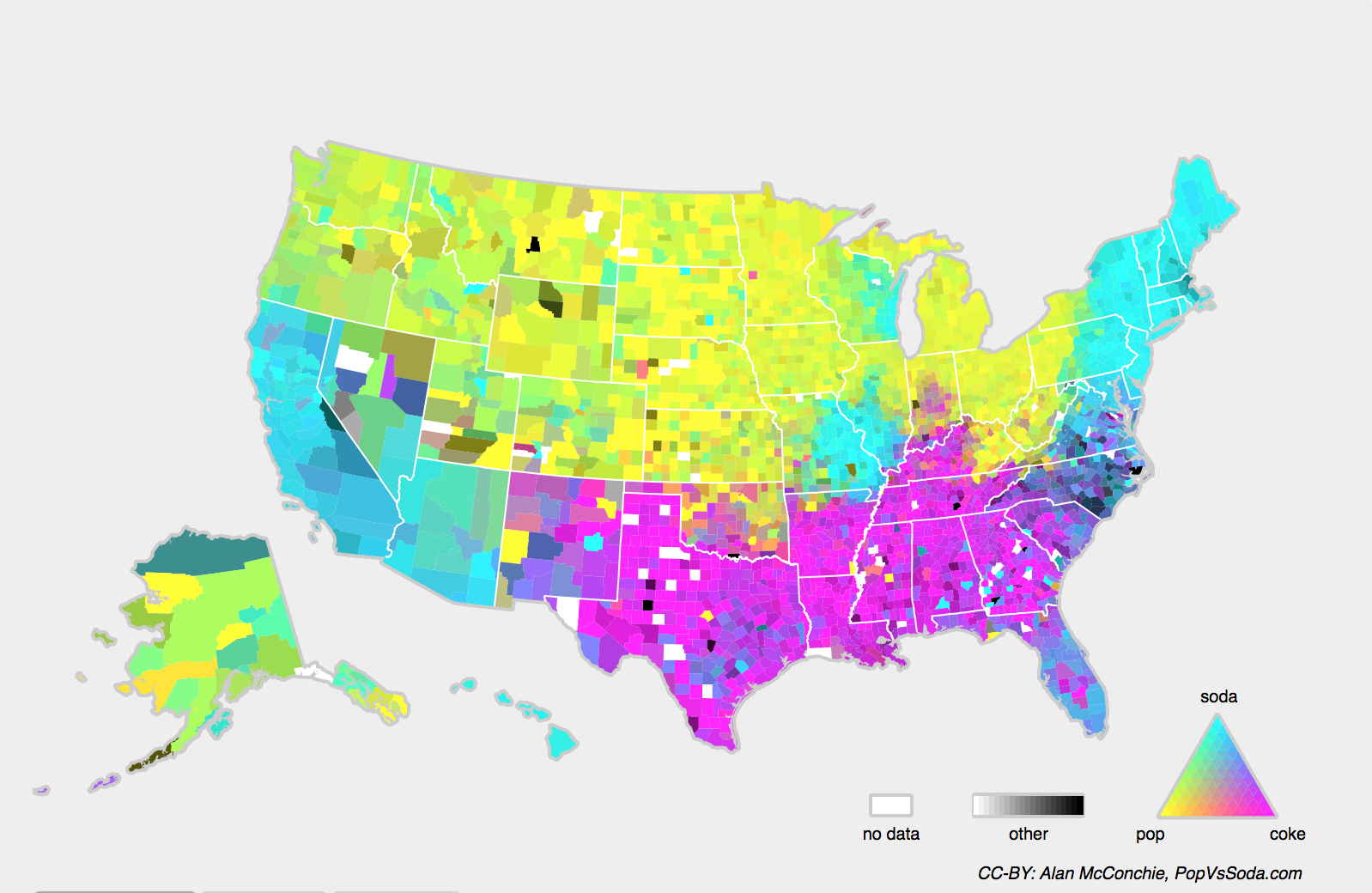 We may also encounter the related problem of concept shift, which arises when the very definitions of labels can change. This sounds weird–-a cat is a cat, no? However, other categories are subject to changes in usage over time. Diagnostic criteria for mental illness, what passes for fashionable, and job titles, are all subject to considerable amounts of concept shift. It turns out that if we navigate around the United States, shifting the source of our data by geography, we will find considerable concept shift regarding the distribution of names for soft drinks as shown in Figure.
